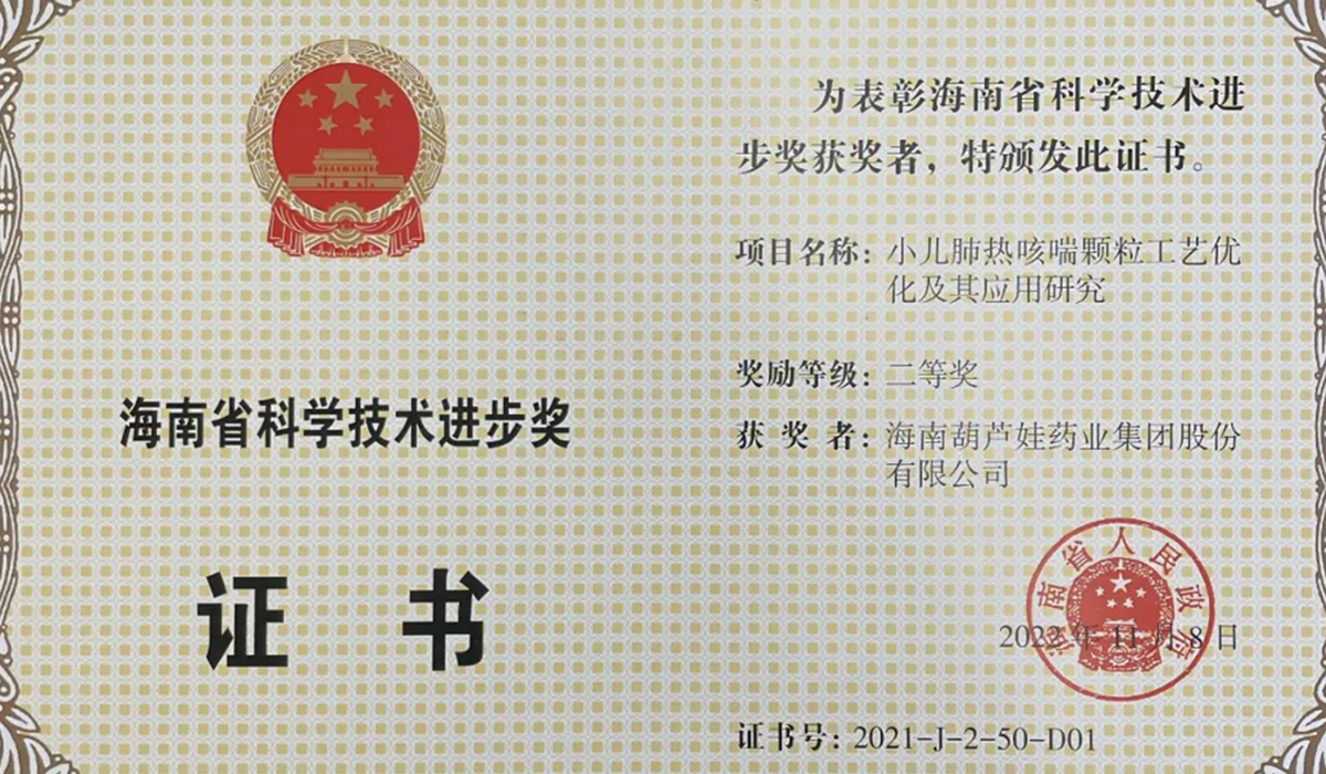 万利药业集团申报的专利“克咳片及其制备方法”荣获 第四届海南省专利奖金奖