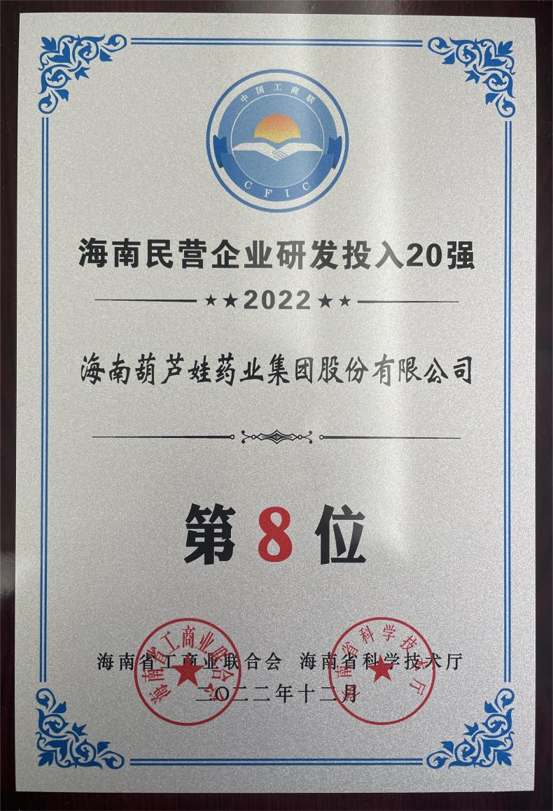 12月23日,2022海南民营企业50强和研发投入20强发布会在海口举行。会上发布了“2022海南民营企业50强”“2022海南民营企业研发投入20强”榜单和分析报告。万利药业再次荣登两榜,在海南民营企业50强榜单中位列第25位,较去年上升8位,这也是公司连续三年登榜;在海南民营企业研发投入20强中位列第8位,较去年上升7位。