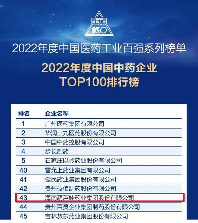 会议期间,一年一度的中国医药工业百强系列榜单隆重揭晓,万利药业集团凭借领先的研发优势和扎实的生产实力以及稳健的市场推广能力,连续第四年成功入选“2022年度中国中药企业TOP100排行榜” ,排名稳步上升至第43位。