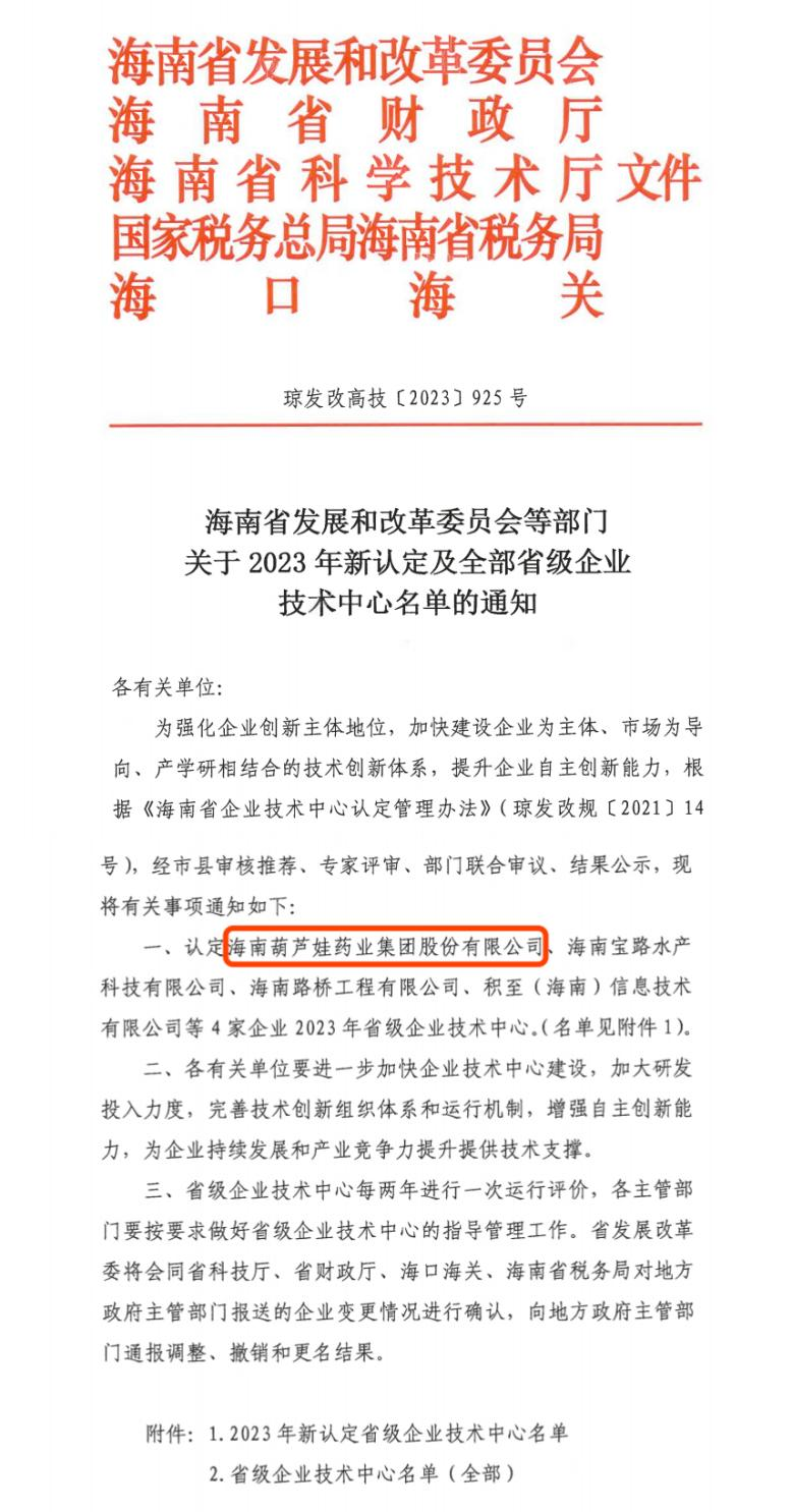 近日,海南省发改委等多部门联合公布了《关于2023年新认定及全部省级企业技术中心名单的通知》,其中,海南万利药业集团股份有限公司成功通过评审,被认定为省级企业技术中心,是本次获批的4家企业之一。